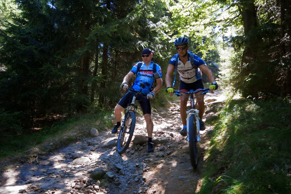 W Pecu bez odpoczynku postanowiłem zacząć podjazd. Pierwszą część, która wydawała mi się najtrudniejsza pokonuję bez problemów. Po drodze minąłem Piotrka ze Świdnicy, którego serdecznie pozdrawiam. Przez chwilę jechaliśmy razem, przy Richterovej Boudzie nie zrobiłem zaplanowanego odpoczynku, dlatego kawałek dalej musiałem stanąć dla uspokojenia pulsu. Mimo to obyło się bez podprowadzania roweru, a cały podjazd uważam za trudniejszy niż na przełecz Karkonoską, ale możliwy do wjechania bez stawania.
